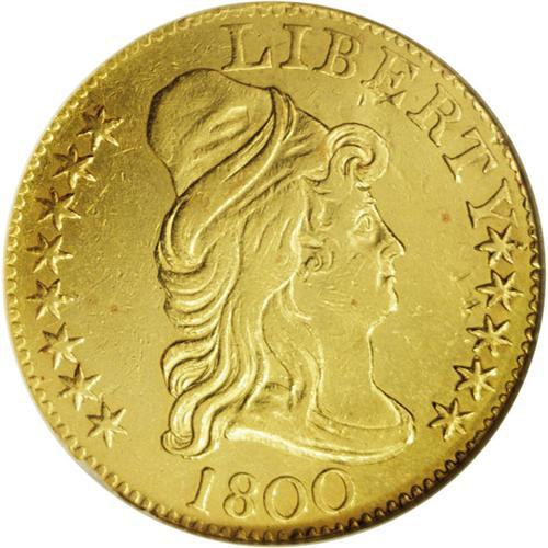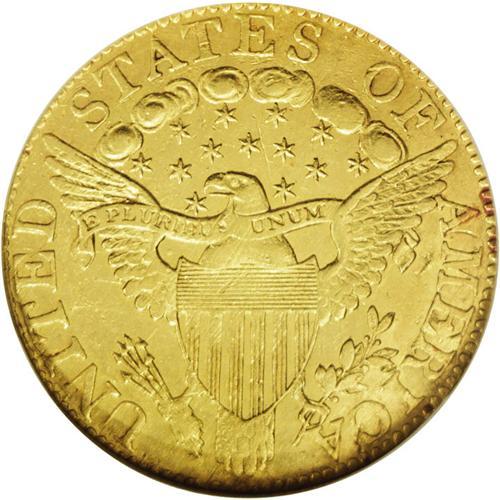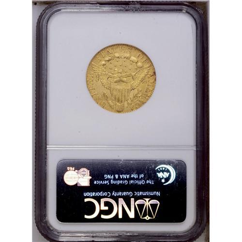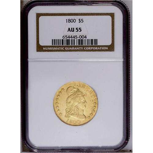 <B>1800<$5> AU55 NGC.</B></I> Breen-6438, B. 1-B, Miller-42, R.3. Most easily attributed by the greater distance between star 13 and the point of the bust, and on the reverse by the center of the E in STATES almost positioned evenly between two clouds. The 1800 is one of the most frequently encountered dates in the Capped Bust, Heraldic Eagle type. Of course, as such it is often a date that is used for type purposes, its popularity being enhanced even more by the 1800 date. This piece has bright, orange-gold surfaces with somewhat soft detailing in the centers. Lightly abraded. <BR><BR><B>Important notice:</B> Heritage usually auctions material at the rate of 200-250 lots per hour. On some occasions eBay Live bid software or the Internet may not be able to keep up with the pace of the auction. We recommend placing a realistic absentee bid now as insurance to avoid disappointment. Occasionally the auctioneer may eliminate or reject an eBay Live bid, and the auctioneer may also reopen a lot after the close of the eBay live bidding (usually because we missed an audience bid), and may reject your bid even if it shows you as the winning bidder. By bidding via eBay Live, you agree that Heritage may award the lot to another bidder at its sole discretion under the circumstances described above or any other reasonable circumstances. Since eBay bids are not shown to us until we open the lot on the floor, we treat those bids just like floor bids. In most cases the floor responds before the eBay bid is presented to us, due to Internet lag time, so for consistency we have made it a policy that floor bids are always considered first over tie eBay live bids. Also please note that all Heritage lots purchased through eBay Live carry a 20% Buyer's Premium. Please make sure you read the Terms and Conditions before you bid. This lot is being auctioned in conjunction with a live floor auction by Heritage Galleries & Auctioneers. All final auction and invoice information will be supplied by Heritage Galleries & Auctioneers, and all other information should be considered preliminary. Lot:2613 <BR><BR><B>Winning Notification and Billing:</B> After the FINAL session in this auction is complete, Heritage will send e-mail and snail mail invoices. This process normally takes several days. All final auction and invoice information will be supplied by Heritage Galleries & Auctioneers, and all other information should be considered preliminary. <BR><BR>This auction will be conducted on a live auction floor and over the Internet through eBay Live. If you choose to place an absentee bid, please take a moment to <font color='#0000ff'><u><a href='http://pages.ebay.com/liveauctions/help/before/laabsentee.html'>learn how eBay Live absentee bidding works</a></u></font><font color='#000000'>