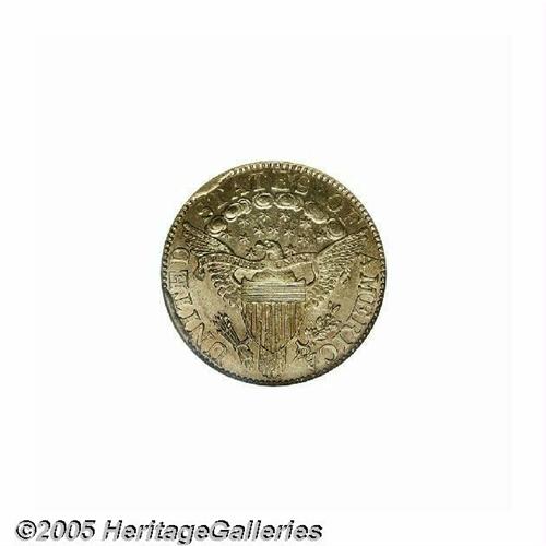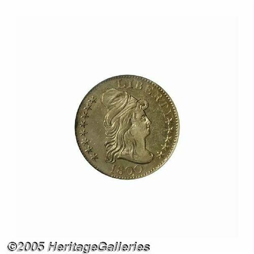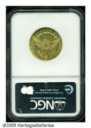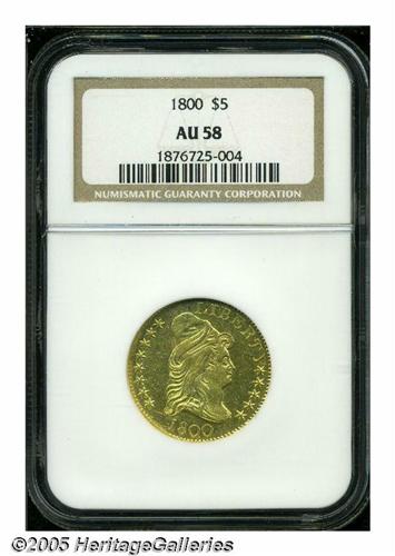 <B>1800<$5> AU58 NGC.</B></I> Breen-6439, B. 1-C, Miller-43, R.4. Identifiable by the blundered M in AMERICA, and a scarcer variety as such. The still-lustrous surfaces are peppered with numerous tiny abrasions on each side, several of which are more noticeable in the obverse field. The bright green-gold color of the coin shows a heavy accent of deep reddish patina around the rims on each side. Well struck with only minor softness noted in the centers.