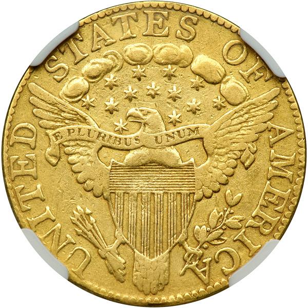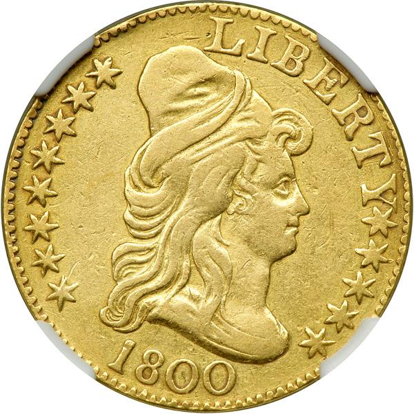 1800. . BD-2, Breen-6438, blunt 1 in date. NGC graded EF-40. Basically untoned with the surface showing minor roughness from its time in circulation. Even color throughout. A scarce early Capped Bust, Large Eagle five. Dannreuther suggests a mintage of 7,500 to 12,500 for the variety, with perhaps 175 to 250 known, giving it a rating of Rarity-3+ (PCGS # 8082) .