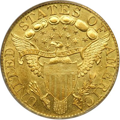 1800 $5 Capped Bust. . BD-5, Breen-6438. PCGS graded MS-63. Well struck and untoned. Great eye appeal. 37,628 struck. The otherwise yellow-gold color yields to warmer light-golden frosty hue on the center high points. Struck with systematic exactness throughout and much crisper than many early Capped Bust fives of this era. The coin has a commanding look to it. Pop 12; 7 finer; 6 in 64; 1 in 66. (PCGS # 8082).