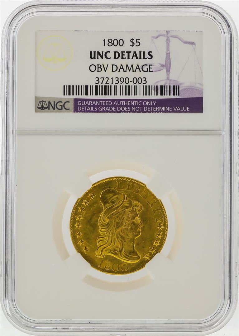 One 1800 $5 Heraldic Eagle Reverse Gold Coin NGC UNC Details. NGC Certified.