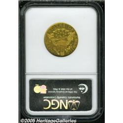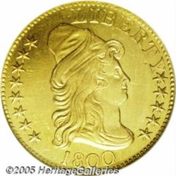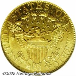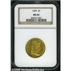 <B>1800 $5 MS64 NGC.</B></I> Breen-6438, B. 1-B, Miller-42, R.4. Five die marriages were used to coin 1800 Half Eagles, four of which share a common obverse die. The reverse die is unique to this variety, however, and is distinguished by a repunched rightmost star. Both sides reveal modest prooflike tendencies in the fields with rich green-gold color and lighter orange-gold overtones. This is a very well defined example for the series with appreciable detail over the peripheries and central devices. The grade-defining abrasions are neither sizeable nor individually distracting. Several diagonal adjustment marks are seen across the shield on the reverse. The 1800 is one of the more readily obtainable early Half Eagles, but the original mintage of 37,628 pieces precludes a large extant population. A lovely coin that would make a pleasing addition to even the most advanced collection. Population: 8 in 64, none finer at either service (2/05).
