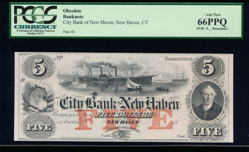 One 1800 $5 New Haven Obsolete Bank Note PCGS 66PPQ.