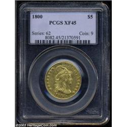 <table><tr><td><TABLE cellSpacing=0 cellPadding=0 width="100%" bgColor=#000000 border=0><TBODY> <TR><TD width="100%"><TABLE cellSpacing=1 cellPadding=3 width="100%" border=0><TBODY><TR><TD width="100%" bgColor=#79735c><FONT face=arial color=#ffffff size=3><B>Description</B> </FONT></TD></TR><TR><TD width="100%" bgColor=#ffffff><FONT face=arial size=2><B>1800 $5 XF45 PCGS.</B></I> Breen-6438, B. 1-B, Miller-42, R.4. The final star is distant from the bust, and the E in STATES has the upright between a pair of clouds. An olive-gold example with bold details and no shortage of shimmering luster. The obverse has a trio of small contact marks, but the surfaces are otherwise pleasing. </FONT></TD></TR></TBODY></TABLE></TD></TR></TBODY></TABLE><BR><A name=PricesRealized></A><TABLE cellSpacing=0 cellPadding=0 width="100%" bgColor=#000000 border=0><TBODY><TR><TD width="100%"><TABLE cellSpacing=1 cellPadding=3 width="100%" border=0><TBODY><TR><TD width="100%" bgColor=#79735c><A name=PR><FONT face=arial color=#ffffff size=3><B>Previous Prices from Heritage Auctions</B> </FONT></A></TD></TR><TR><TD bgColor=#f6f6ed><TABLE cellSpacing=0 cellPadding=0 width="100%" border=1><TBODY><TR><TD align=middle width="33%"><B>Date</B></TD><TD align=middle width="33%"><B>Service</B></TD><TD align=middle width="33%"><B>Price</B></TD></TR><TR bgColor=whitesmoke><TD width="33%"><B>06/08/2002</B></TD><TD width="33%">ANACS</TD><TD width="33%">$4,140.00</TD></TR><TR bgColor=whitesmoke><TD width="33%"><B>01/01/2000</B></TD><TD width="33%">PCGS</TD><TD width="33%">$2,760.00</TD></TR><TR bgColor=whitesmoke><TD width="33%"><B>01/01/1991</B></TD><TD width="33%">PCGS</TD><TD width="33%">$2,530.00</TD></TR><TR bgColor=whitesmoke><TD width="33%"><B>01/01/1996</B></TD><TD width="33%">PCGS</TD><TD width="33%">$2,310.00</TD></TR></TBODY></TABLE></TD></TR><TR><TD bgColor=#ffffff><FONT face=arial size=1 ?>PLEASE NOTE: All prices realized reflect the final hammer price PLUS the buyer's premium in auctions that charge a buyer's premium. Each item has a notation at the top of the listing indicating whether that lot included a buyer's premium. Example: A item that sells with a final hammer price of $100 and a 20% buyer's premium will display with a price realized of $120. All information listed is intended to be as accurate as possible, but errors are possible. Please use this guide carefully and inform us of any inaccuracies. </FONT></TD></TR></TBODY></TABLE></TD></TR></TBODY></TABLE><BR><TABLE cellSpacing=0 cellPadding=0 width="100%" bgColor=#000000 border=0><TBODY><TR><TD width="100%"><TABLE cellSpacing=1 cellPadding=3 width="100%" border=0><TBODY><TR><TD width="100%" bgColor=#79735c colSpan=6><FONT face=arial color=#ffffff size=3><B>Price Guide*</B> </FONT></TD></TR><TR bgColor=#f6f6ed><TD align=middle><B>Grade</B> </TD><TD align=middle><B>Coin World<BR>(Trends)</B> </TD><TD align=middle><B>Numismedia<BR>Retail</B> </TD><TD align=middle><B>Numismedia<BR>Wholesale</B> </TD><TD align=middle><B>Coin<BR>Universe</B> </TD><TD align=middle><B>Heritage<BR>Value Index</B> </TD></TR><TR bgColor=#ffffff><TD align=middle>40</TD><TD align=right>$3,500.00</TD><TD align=right>---</TD><TD align=right>$2,530.00</TD><TD align=right>$2,650.00</TD><TD align=right>$2,245.00</TD></TR><TR style="FONT-WEIGHT: bold" bgColor=#cccfdd><TD align=middle>45</TD><TD align=right>---</TD><TD align=right>---</TD><TD align=right>---</TD><TD align=right>---</TD><TD align=right>$2,802.92</TD></TR><TR bgColor=#ffffff><TD align=middle>50</TD><TD align=right>$5,500.00</TD><TD align=right>---</TD><TD align=right>$3,350.00</TD><TD align=right>$2,925.00</TD><TD align=right>$3,520.63</TD></TR><TR bgColor=#ffffff><TD colSpan=6><FONT size=1>*All information listed is intended to be as accurate as possible, but errors are possible. No item may be returned or refused based on this information which is provided as a service to our customers. You should contact each pricing source directly to determine the accuracy of this information. </FONT></TD></TR></TBODY></TABLE></TD></TR></TBODY></TABLE><BR><TABLE cellSpacing=0 cellPadding=0 width="100%" bgColor=#000000 border=0><TBODY><TR><TD width="100%"><TABLE cellSpacing=1 cellPadding=3 width="100%" border=0><TBODY><TR><TD width="100%" bgColor=#79735c><FONT face=arial color=#ffffff size=3><B>Population Guide</B> </FONT></TD></TR><TR bgColor=#ffffff><TD align=middle><!-- Begin Output of Population Grid--><TABLE cellSpacing=0 cellPadding=0 width="100%" border=0><TBODY><TR><TD vAlign=center><TABLE cellSpacing=0 width="100%" border=1 cellsadding="3"><TBODY><TR><TD vAlign=center><TABLE cellSpacing=0 cellPadding=3 width="100%" border=1><TBODY><TR><TD vAlign=center align=middle bgColor=#f0f1e8 colSpan=2 <CENTER><FONT face=Arial size=2><B>PCGS Pop </B></FONT><CENTER></CENTER></TD><TD vAlign=center align=middle bgColor=#f0f1e8 colSpan=2><CENTER><FONT face=Arial size=2><B>NGC Pop</B></CENTER></FONT></TD></TR><TR><TD vAlign=center><FONT face=Arial size=2>(45)</FONT> </TD><TD vAlign=center align=right><FONT face=Arial size=2>31</FONT> </TD><TD vAlign=center><FONT face=Arial size=2>(45)</FONT> </TD><TD vAlign=center align=right><FONT face=Arial size=2>6</FONT> </TD></TR><TR><TD vAlign=center><FONT face=Arial size=2>(>45)</FONT> </TD><TD vAlign=center align=right><FONT face=Arial size=2>200</FONT> </TD><TD vAlign=center><FONT face=Arial size=2>(>45)</FONT> </TD><TD vAlign=center align=right><FONT face=Arial size=2>153</FONT> </TD></TR></TBODY></TABLE></TD></TR></TBODY></TABLE></TD></TR></TBODY></TABLE><!-- End Output of Population Grid--></TD></TR></TBODY></TABLE></TD></TR></TBODY></TABLE><BR><TABLE cellSpacing=0 cellPadding=0 width="100%" bgColor=#000000 border=0><TBODY><TR> Important notice: Heritage usually auctions material at the rate of 200-250 lots per hour. On some occasions eBay Live bid software or the Internet may not be able to keep up with the pace of the auction. We recommend placing a realistic absentee bid now as insurance to avoid dis