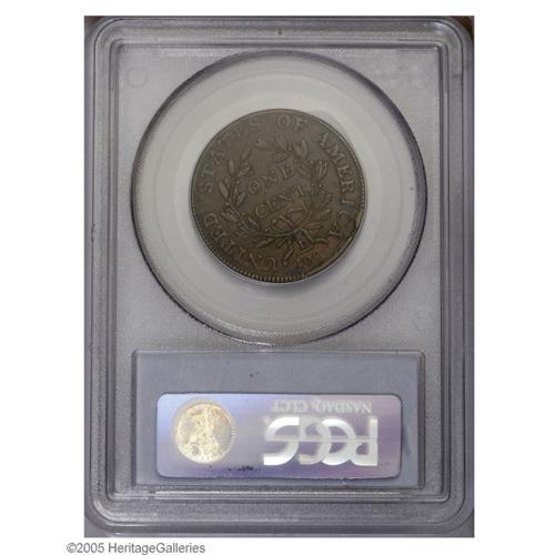 <B>1800/79<1C> AU50 PCGS.</B></I> S-194, Low R.3. A thin die break through the fraction bar and a noticeable cud at the base of the reverse confirm this slightly scarcer variety. Clear definition of the 7 and 9 underdigits is also seen on the date. Medium brown color, about 45 degrees of counterclockwise rotation of the dies is seen. A curving mark across Liberty's neck serves as a pedigree identifier. Population: 2 in 50, just 5 are finer (10/05).