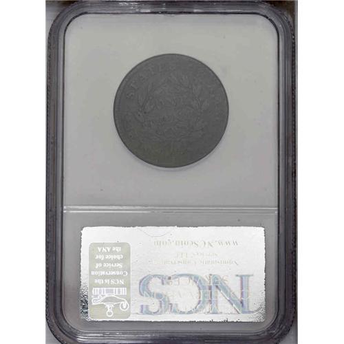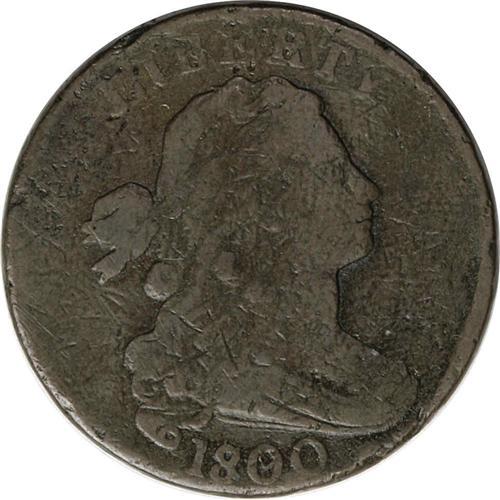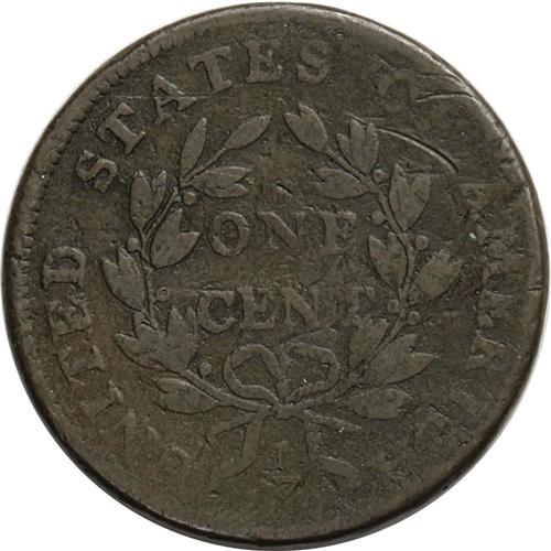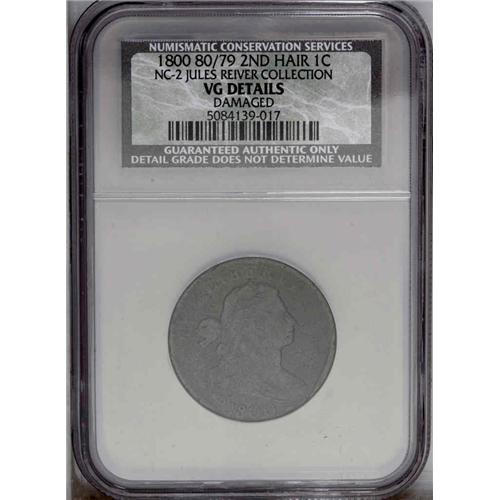 <B>1800/79<1C> NC-2, B-11, High R.6--Damaged--NCS. VG Details. Good 5 EAC.</B></I> The obverse has a thin but prominent rim break from 3 o'clock to 5 o'clock. Only two die states are recorded, with and without this slender cud. The rarity of this variety was incorrectly listed in the Breen <I>Large Cent Encyclopedia,</B></I> and should have been recorded as High Rarity 6. At the time, just 13 examples were recorded. Two more have been discovered since. Of the 15, only one is better than VG. Like so many other rarities, many more collectors are searching for these coins than every before. In 1958, when <I>Penny Whimsy</B></I> was published, only four examples were known. With just one example discovered every four years since 1958, the odds are slim that any individual collector will be so fortunate. A better choice would be to bid on this Reiver Collection coin as it crosses the auction block.<BR><I>Ex: Donald H. Boller (2/1984); Del Bland (2/18/1984).</B></I> Envelope Included.