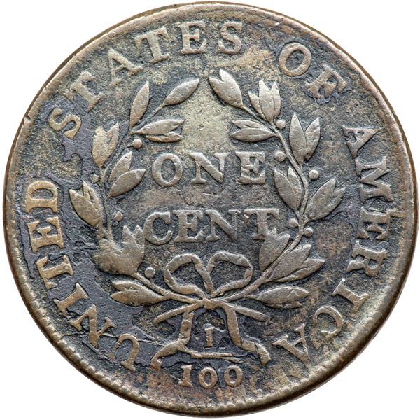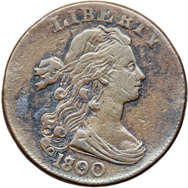 1800/79 S-193 R4 Overdate 80 over 79 with Style II Hair F12. Sharpness near VF25 but there is some shallow black scale in protected areas on both sides, mostly in the hair below the ribbon and around UNITED. The planchet is reasonably smooth but does display numerous tiny contact marks, none notable or distracting but more than normal for the sharpness grade. Light to medium chocolate brown with dark olive in protected areas. E-MDS, Breen state II, with a clear die crack arcing through the fraction and UN. The date is bold and the overdate is obvious to the unaided eye.