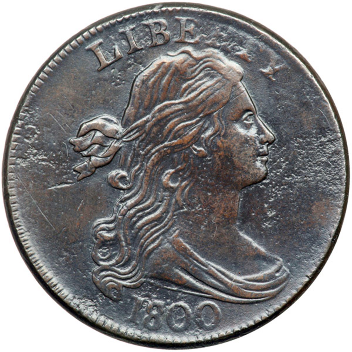 1800/798 S-191 R3 Overdate 800 over 798, Style I Hair VF20. Sharpness EF40 or slightly better but there are a few patches of shallow corrosion on the obverse, the largest one in the field before the face. No verdigris or significant contact marks, and most of the planchet is smooth and very attractive. Lightly cleaned and nicely retoned glossy chocolate brown, the reverse several shades lighter than the obverse. M-LDS, Breen state VI, showing extensive die failures on the reverse. Removed from a SEGS slab graded AU50 with micro corrosion (SEGS label included).