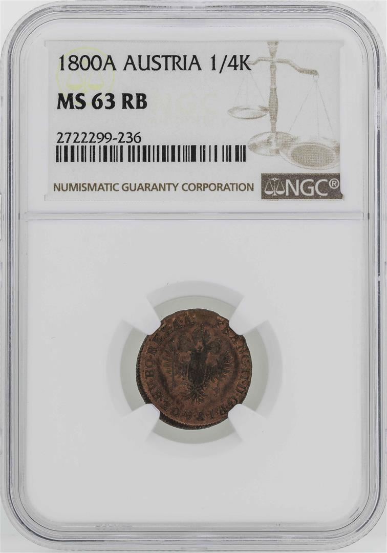 One 1800-A Austria 1/4 Kreuzer Coin NGC MS63RB. NGC Certified.
