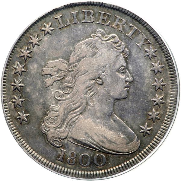 1800 B-2, BB-182 Normal Date Rarity 6. PCGS graded VF-35. CAC Approved. Subset of PCGS # 6887. In a new secure plus holder. It seems that nothing higher than EF40 is available for this variety, which places this VF35 high on the Condition Census; even so, few are available even in this grade. Smooth gray finish that is lighter on the devices and then deeperns to normal old-silver hues. There are a few light contact marks from its days spent in circulation, far fewer in number than one sees on most Draped Bust dollars in this grade, however. The rims show some of the widest dentils we have seen on 1800.