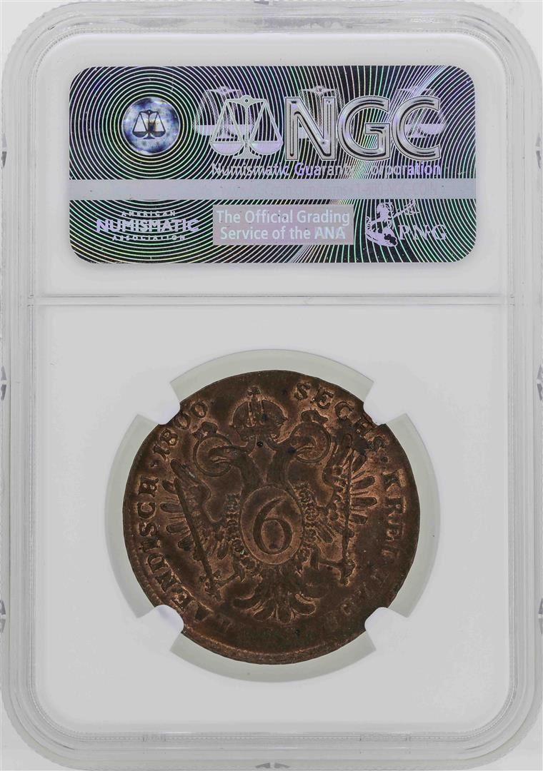 One 1800-B Austria 6 Kreuzer Coin NGC MS63BN. NGC Certified.