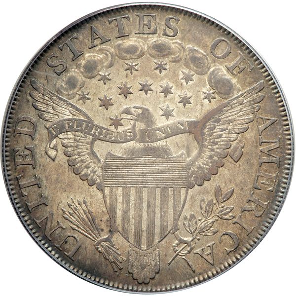 The AMERICAI variety is something of a mystery; the question is asked, what was the cause of the reverse die flaw that slightly resembles an wayward I in the field? Bowers gives his opinion that the stray mark is "perhaps from a punch or from a stray piece of metal during the die making process … ." Breen, in his Complete Encyclopedia, suggested that the errant letter might be "the right leg of a mostly effaced A," although close examination of the mark indicates that this is not the case. Whatever the reason, the desirability of this variety has continued to this day. BB-192 is the more common of the two AMERICAI 1800 dollar varieties, though both are legitimately rare in Mint State. Rich, satiny luster blankets both sides of this boldly impressed early dollar. Those seeking a high end specimen of this popular variety will prudently watch to the current offering. Pop 1; none finer at PCGS for the variety (PCGS # 40082) .