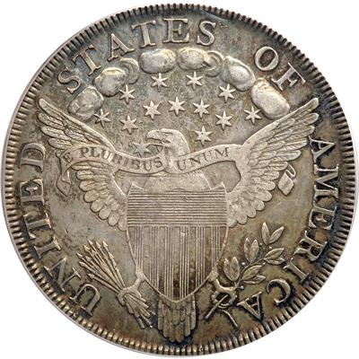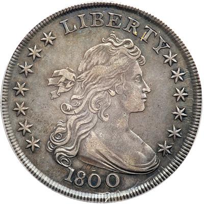 1800 Draped Bust Dollar. "AMERICAI". PCGS graded EF-40. A very popular variety. Nicely toned. The AMERICAI variety is the odd-man-out when it comes to Bust Dollars; many collectors are left scratching their heads in trying to explain the cause of the reverse die flaw that loosely resembles an I without serifs. It may be a stray mark from the engraver's tool. Whatever the cause, collectors have seen fit to call it the AMERICAI variety. Well struck. The underlying dove-gray toning is nicely framed by slightly mellower "old silver" color around devices. Those seeking an attractive example of this popular variety will pay careful attention to the current offering (PCGS # 40082) .
