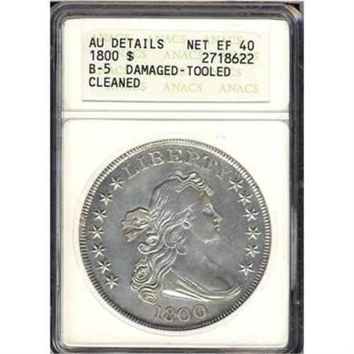 <b>1800 Draped Bust Dollar. ANACS graded AU Details. Net EF40 Damaged. Tooled. Cleaned. Bolender-5.</b> A litany of drawbacks, it seems, from the grade on ANACS's holder, and yet the coin itself to our eyes is eminently presentable and appropriate for a none-too-fussy collector's set. Light silvery gray color with no tarnish; meanwhile, the rims are choice on both sides <b>(PCGS # 6887)</b>