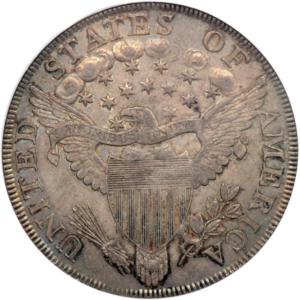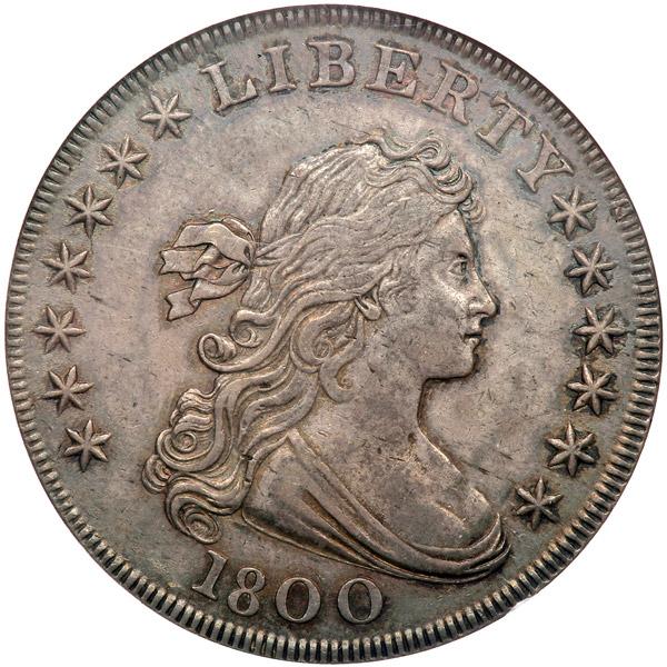 1800 Draped Bust Dollar. NGC graded AU-58. Nice even original toning on both sides. A very attractive Draped Bust Dollar with that have alluded surface problems like nicks and marks; some luster present beneath the light gray toning. No weak spots in the strike, devices are finely detailed. Pop 34; 12 finer.