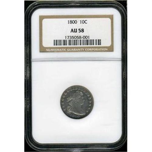 <b>1800 Draped Bust Dime. NGC graded AU58.</b> Lustrous light to medium gray, a bust dime of the early period which has grand overall eye appeal. The above-average strike complements this eye-appeal and, some might say, adds immeasurably to the appearance <b>(PCGS # 4470)</b>
