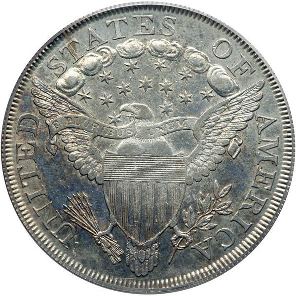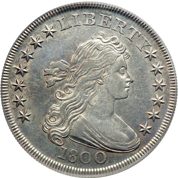 1800 Draped Bust Dollar. PCGS graded AU-55. Housed in a new secure plus holder. Pop 1; none finer at PCGS for the variety. Mostly untoned with a minute splash of blue coloration here and there. Quite lustrous, well centered with long dentils providing a picture-frame border for the inner design. Surfaces smooth and mar-free. A winner in anyone's book!