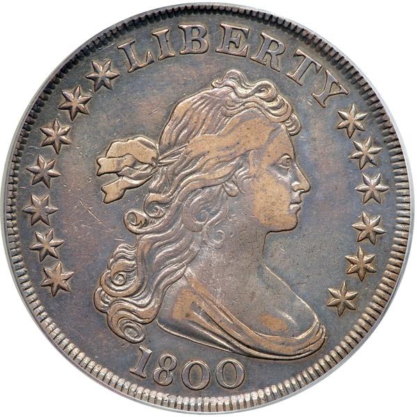 1800 Draped Bust Dollar. PCGS graded VF-35. Housed in a new secure plus holder. Pop 1; 2 finer in 53 for the variety. Golden tones paired with a trace of magenta blanket both sides beautifully.