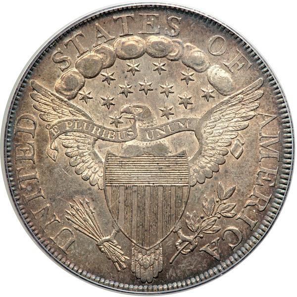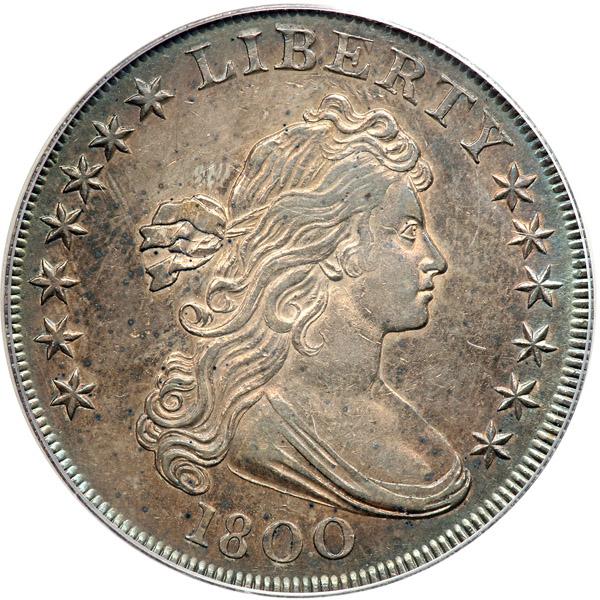 1800 BB-193, as we know the variety today, is one of the most plentiful dollars of the year, and is about tied with BB-187 as the most common. An estimated 76 to 200 are known. In the present text, the population of BB-193 includes what used to be called Bolender-18, from the same dies, but a later state with clashing. Today, specialists recognize Bolender-18 as simply a later die state of BB-193. This coin was considered B-13 all along. The rare Die State I. Pop 1; 1 finer in 58 for the variety (PCGS # 40077) .