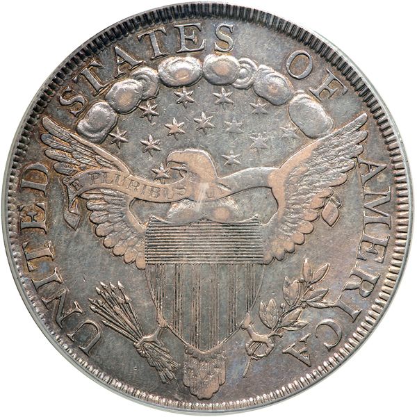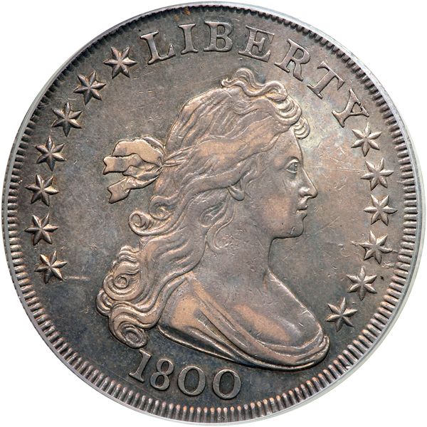 1800 Draped Bust Dollar. PCGS graded AU-53. Subset of PCGS # 6887. In a new secure plus holder. Condition Census. A resplendent example of the finest order for the modest About Uncirculated 53 grade. Some lingering luster graces the reddish golden to champagne and gray surfaces. Sharply struck for the date, easily finer in sharpness than even higher grade specimens, with some minor weakness indicated on the eagle's head and breast along with the right half of the scroll where UNUM disappears. A small mark adjacent to the eagle's neck where the scroll crosses. Otherwise, the fields fresh and free of abrasions. Pop 2; 1 finer in 55 for the variety (PCGS # 40067) .
