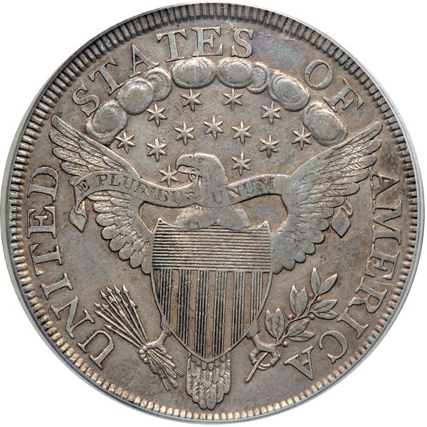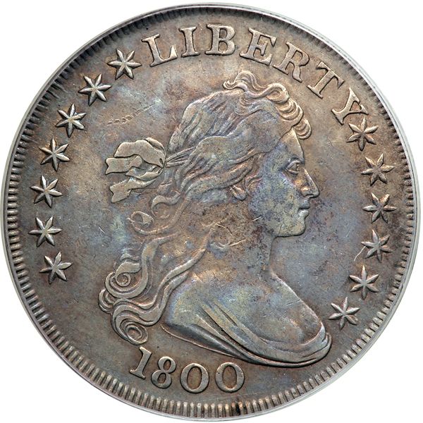 1800 Draped Bust Dollar. PCGS graded EF-45. Subset of PCGS # 6887. In a new secure plus holder. Condition Census. Minor weakness in centers, as struck. Variegated toning over both sides with russet-gold to light steel-blue predominant. The upper right star on BB-185 is in position similar to the obverse of the 1804 dollars, with two points almost touching Y. This obverse was not known to Haseltine when he compiled his Type-Table in 1881. Obverse die used to strike BB-185 only.