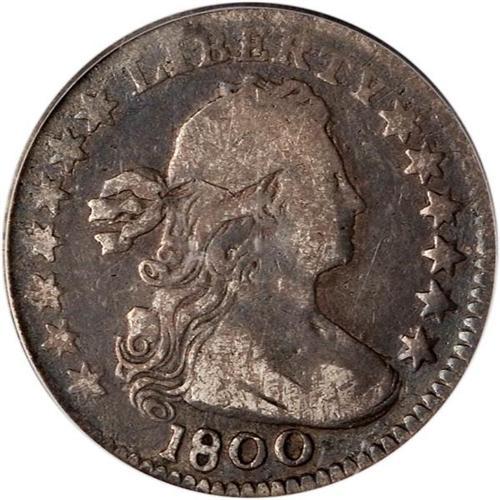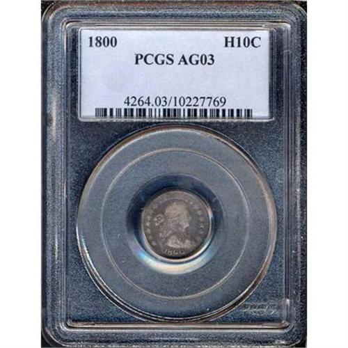 <b>1800 Draped Bust Half Dime. PCGS graded AG3.</b> Well worn yet still very presentable in its medium gray cloak of original patina topped by lighter "rubbed silver" accents. The obverse is much sharper than the reverse and could grade Very Good were the more worn reverse the same quality <b>(PCGS # 4264)</b> <i>