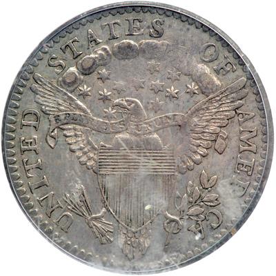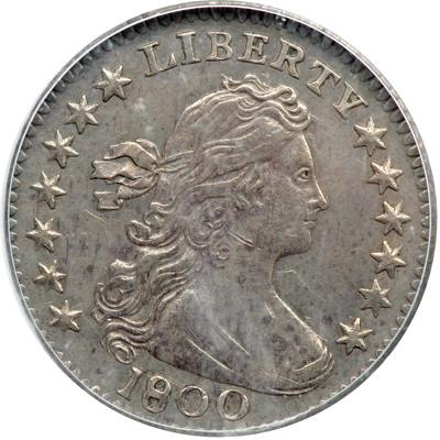1800 Draped Bust Half Dime. . LM-1, V-1. PCGS graded AU-55. Even grey toning. A small mark on the neck. Only 24,000 pieces struck. This is the first year of issue for the new Heraldic Eagle reverse design and one that is much nicer than most, including an even strike on the devices. Perfect LIBERTY with the upper inside point of star 1 close to the small middle curl. Seldom seen with perfect dies. All four digits in the date are equally spaced on this variety, and the first star is low in the field. Pop 24; 47 (PCGS # 4264) .