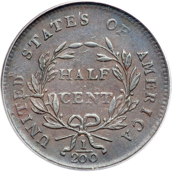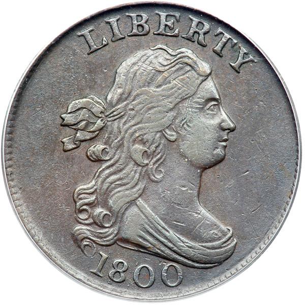 1800 C-1 R2. PCGS graded AU-50. Frosty olive and chocolate brown with darker steel brown toning on the highpoints. Traces of satiny mint luster can be found in protected areas on both sides. No roughness or verdigris. The only marks are a couple light ones well-hidden in the hair under BER. M-LDS, Manley state 4.0. The curl left of the date is open. Our grade is VF35+, very close to EF40.