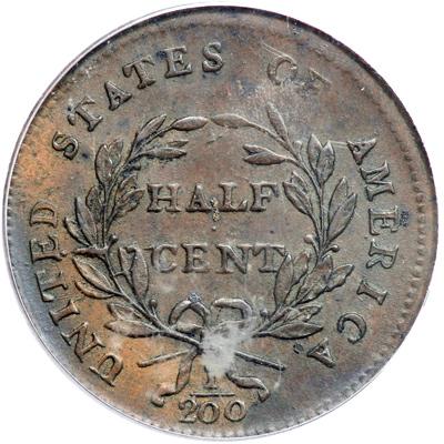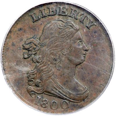 1800 C-1 R2. PCGS graded MS-63 Brown. Frosty steel brown and chocolate with specks of darker olive and steel on the obverse and a swipe of lighter tan toning on the left side of the reverse. There is a speck of raised reddish verdigris in the field before the nose and a couple small spots of fine carbon on the reverse. Just a light touch of friction on the highpoints. MDS, Manley state 3.0. The lowest curl is still complete. Our grade is net EF45. PCGS population 4 with 4 higher.