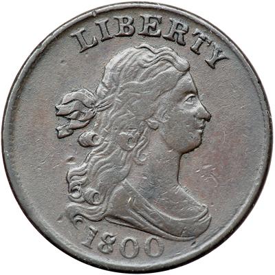 1800 C-1 R2. VF-25. Glossy chocolate and light olive with darker steel brown toning on the highpoints. The only notable mark is a tiny pinprick under the bust tip. LDS, Manley state 5.0. A nice example for the grade.