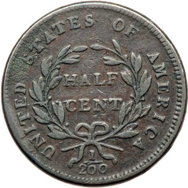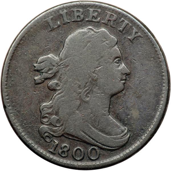 1800 C-1 R2 VG10. Glossy chocolate and steel brown with darker steel toning on the highpoints. The surfaces are smooth and free of defects except for an arc of shallow verdigris at D-STAT. Rare E-MDS, Manley state 2.0. The die clashmarks at LIB and UNITE are clear. Weight 86.4 grains. Davy #00.1.14.