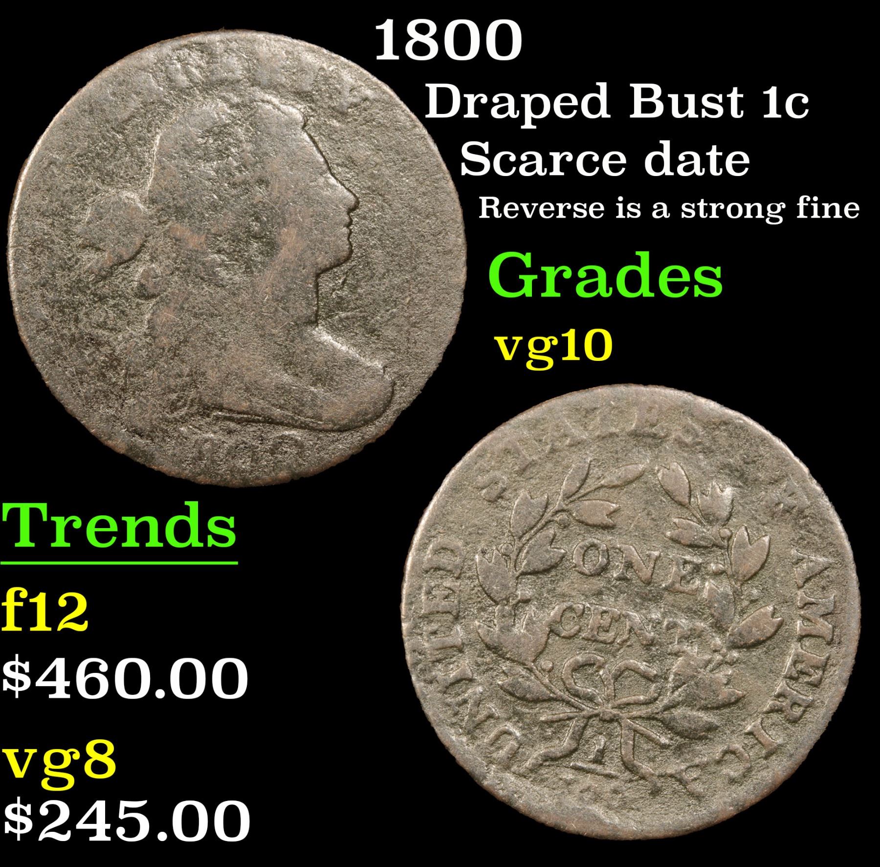 1800 Draped Bust Large Cent 1c Grades vg+. Scarce date; Reverse is a strong fine A Corey's Pick
