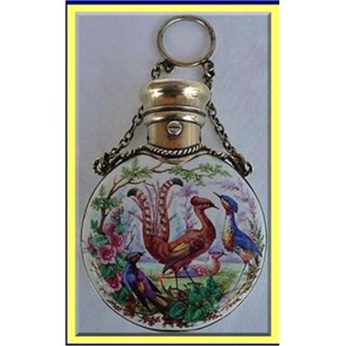 Handpainted enamel metal mounted porcelain perfume / scent bottle chatelaine with chain and