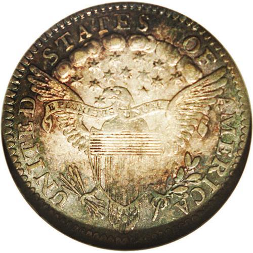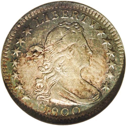 <B>1800<H10C> AU58 NGC.</B></I> V-1, LM-1, R.3. Rich jade-green toning dominates the borders, and encroaches on the faintly toned centers. This generally lustrous example shows slight friction on Liberty's shoulder and forehead. The softer definition on the vertical shield lines is due solely to the strike. Clashed beneath the chin and above the M in UNUM, but no abrasions are readily detected.