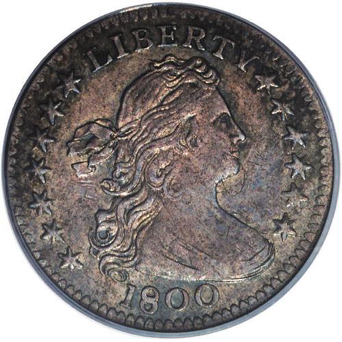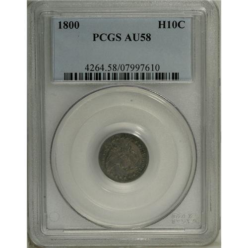<B>1800 H10C AU58 PCGS.</B></I> V-1, LM-1, R.3. An impressive early silver type coin, well struck aside from a cloud and a few stars on the reverse. Richly toned dove-gray and golden-brown. Luster shimmers when the piece is rotated beneath a light. Each side has a couple of minor marks, and an interesting U-shaped lintmark (as made) is noted beneath Liberty's chin. Population: 13 in 58, 37 finer (11/06).<BR><BR><b>Shipping:</b> Coin/Currency (<a target="_blank" href="http://www.heritageauctions.com/common/shipping.php">view shipping information</a>)