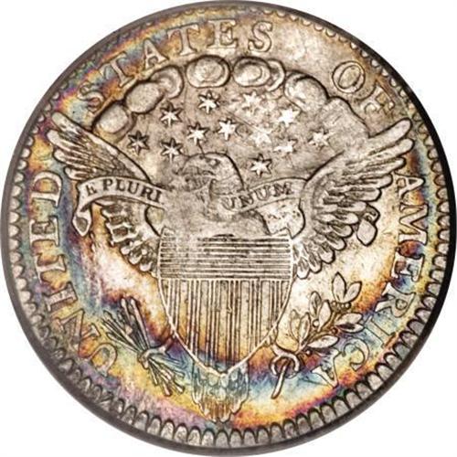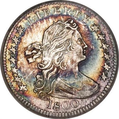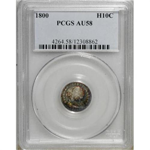 <B>1800 H10C LIBEKTY AU58 PCGS.</B></I> V-2, LM-3, R.4. Vividly toned in bands of sun-gold, ruby-red, and emerald-green. The obverse center and the upper reverse are slate-gray. The field above the eagle has a few faint thin marks. A relatively late die state with reverse buckling near the BUS in PLURIBUS.<BR><BR><B>Coin Engraver:</B> Robert Scot<BR><BR><b>Shipping:</b> Coins & Currency (<a target="_blank" href="http://www.heritageauctions.com/common/shipping.php">view shipping information</a>)