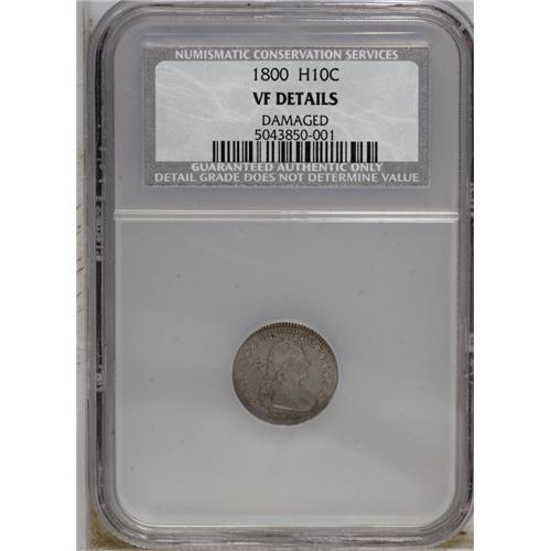 <B>1800 H10C --Damaged--NCS. VF Details.</B></I> V-1, LM-1, R.3. Moderately worn with pleasing blue-gray and gold-gray patina. Two significant flaws, a deep abrasion at the base of the I in LIBERTY and an indentation on the shield, account for the details grade.<BR><BR><b>Shipping:</b> Coin/Currency (<a target="_blank" href="http://www.heritageauctions.com/common/shipping.php">view shipping information</a>)