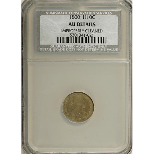 <B>1800 H10C LIBEKTY--Improperly Cleaned--NCS. AU Details.</B></I> V-2, LM-3, R.4. The popular variety with a missing upper crossbar on the R in LIBERTY, which makes it vaguely resemble the letter K. Chestnut-brown toning dominates this lightly circulated example, which appears smooth to the unaided eye. Study using a glass reveals a few hairlines on each side. The strike is bold across much of the portrait and eagle, although areas near the eagle's head are typically brought up.<BR><BR><b>Shipping:</b> Coins & Currency (<a target="_blank" href="http://www.heritageauctions.com/common/shipping.php">view shipping information</a>)