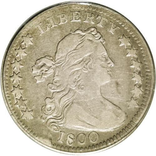 <B>1800<H10C> LIBEKTY VF30 ANACS.</B></I> V-2, LM-3, R.4. A defective R punch led to the LIBEKTY variety. From late dies with crumbling left of the date and beneath the eagle's beak. This richly defined slate-gray representative has a small roundish depression on the upper cheek, but is otherwise charming.