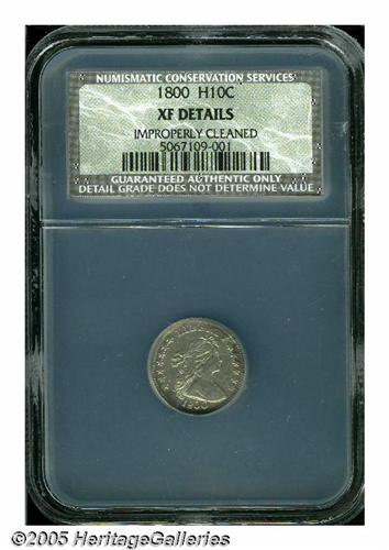<B>1800<H10C> LIBEKTY XF Details, Improperly Cleaned, NCS.</B></I> V-2, LM-3, R.4. A faintly hairlined slate-gray example of this popular <I>Guide Book</B></I> variety. A bold example with traces of luster within the hair and other recessed areas. The weakness near BUS is mint caused by damage to the die, and along with the die break at 7 o'clock on the obverse is diagnostic of the later die state.