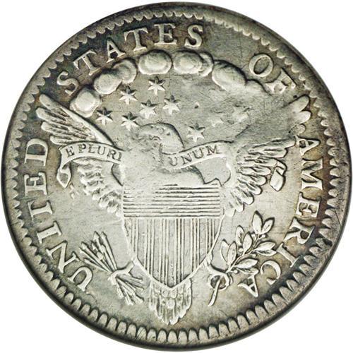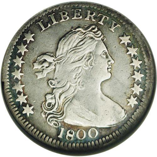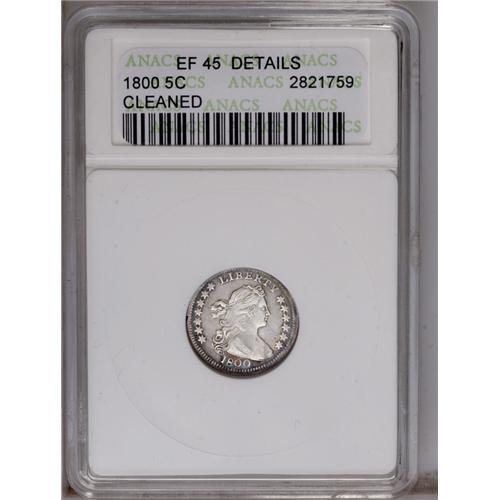 <B>1800<H10C> LIBEKTY--Cleaned--ANACS. XF45 Details.</B></I> V-2, LM-3, R.4. Dashes of electric-blue and honey-brown color visit this predominantly slate-gray example. The surfaces are subdued but certainly presentable. The reverse die is failing near the eagle's beak; this causes striking softness on the neck curls. The cloud beneath the F in OF is also weak, but the remainder of the design is crisp.