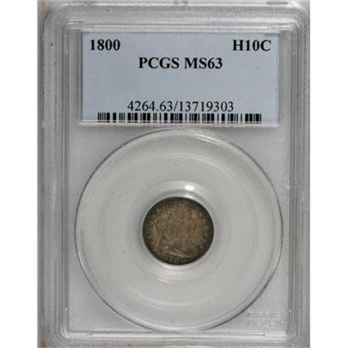 <B>1800 H10C MS63 PCGS.</B></I> V-1, LM-1, R.3. The digit 1 in the date is centered over a dentil, the 8 is configured from two small "0" punches, and a leaf is joined to the left diagonal of the last A in AMERICA. Die clashing develops at the top of the date. This is the most common die marriage of 1800, and is available in all Mint State grades.<BR> This Select example exhibits soft golden-gray patina with occasional hints of light blue. Well centered design elements display sharp definition, though weakness is apparent in the clouds and stars between the last S in STATES and the O of OF. A few minor handling marks are noted on the obverse. <BR><BR><B>Coin Engraver:</B> Robert Scot<BR><BR><b>Shipping:</b> Coins & Currency (<a target="_blank" href="http://www.heritageauctions.com/common/shipping.php">view shipping information</a>)