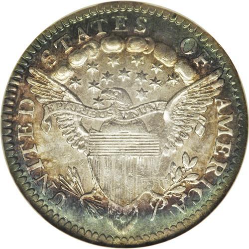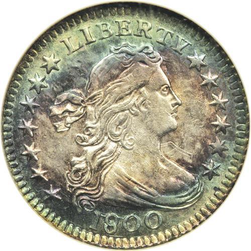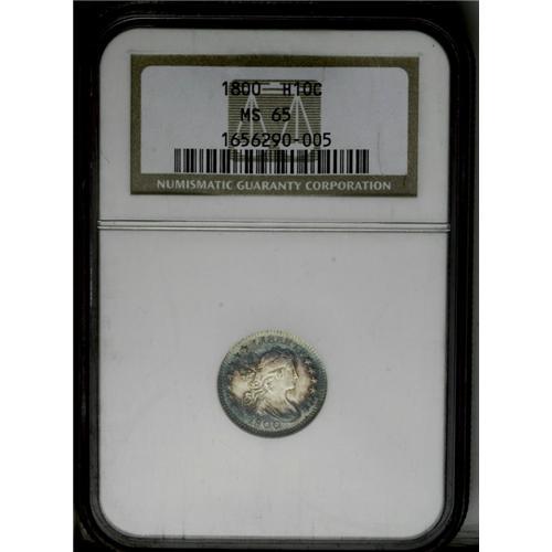 <B>1800<H10C> MS65 NGC.</B></I> V-1, LM-1, R.3. This variety has LIBERTY spelled correctly. The date is widely and evenly spaced with the digit 1 centered over a single dentil. LIBERTY is also evenly spaced. Stars on the left side are all well-spaced as are the stars on the right. Star 1 is close to the second curl and star 7 is distant from L. Star 8 is slightly closer to Y (than star 7 to L) and star 13 is similarly close to the bust.<BR> The reverse has a leaf joined to the outer left base of the final A and another leaf solidly joined to the right base of I. The outside arrowhead ends at the extreme left base of N, and the longest arrowhead ends below the center of that letter. Stars 1 through 4 in the top row are each separated from clouds while stars 5 and 6 each lightly touch a cloud. The eagle's upper beak comes down to join star 12 between two points. This star just misses touching the lower beak, and joins the scroll over the outside left serif of U. The I in UNITED and the I in AMERICA are each centered beneath a single dentil.<BR> The obverse of this specimen has only light clash marks. The reverse has a hairline die crack from M to the eagle's wing and shield, continuing faintly through the left reverse field to I of UNITED.<BR> This is the most common die marriage among 1800 half dimes, with four known varieties described in the standard reference. The example that is offered here is a remarkable Gem that should easily please the specialist. The upper obverse and lower reverse are somewhat weak, but all other design elements are boldly defined. It is a well-centered impression with full obverse and reverse borders. Both sides have brilliant silver color at the centers, surrounded by pale gold and vibrant sea-green toning. Census: 5 in 65, 3 finer (7/06).
