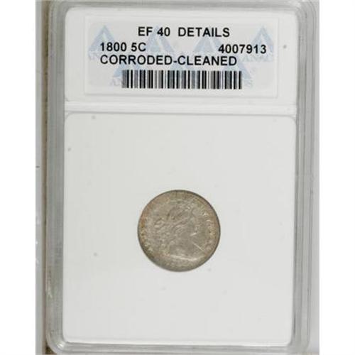 <B>1800 H10C LIBEKTY--Corroded, Cleaned--ANACS.</B></I> V-2, LM-3, R.4. The popular LIBEKTY variety derives its name from a broken letter punch used when the die was created. The top of the R is broken, and resembles a K. Light silver surfaces are rough from corrosion with a few minor hairlines and some light scratches. Traces of gold toning along the borders enhance the overall appearance.<BR><BR><B>Coin Engraver:</B> Robert Scot<BR><BR><b>Shipping:</b> Coins & Currency (<a target="_blank" href="http://www.heritageauctions.com/common/shipping.php">view shipping information</a>)