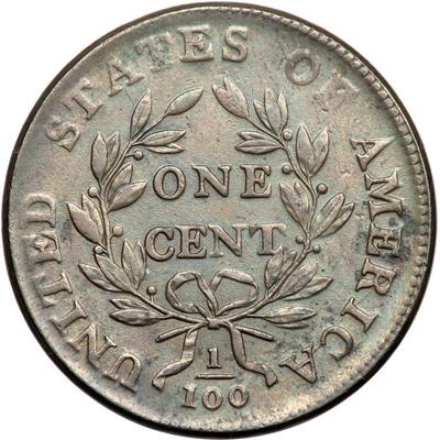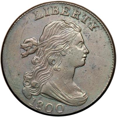 1800 NC-4 R7. EF-40. Noyes Plate Coin. Ten points sharper but lightly cleaned and retoned an attractive glossy bluish steel and chocolate brown. The surfaces are smooth and attractive except for some shallow pitmarks at MER in AMERICA. Only a few light contact marks, a light nick on the upright of the L in LIBERTY and a couple more in the field just to the left are the only notable ones. Sharply struck EDS, the die cracks behind the portrait are clear but not yet strong. The early die state is unique as all the other examples have at least one large cud break behind the portrait. Sharp doubling slows along the lower edge of the jaw. Called AU50 net EF40 and finest known by a large margin in the Noyes census, photo #21847. Bland says AU50 and CC#1 by a rather obscene margin as well as the next best grades only VG7 in both census lists. Only 8 are known of the die variety, regardless of the die state. This is the Noyes plate coin for the variety. DWH #2804.