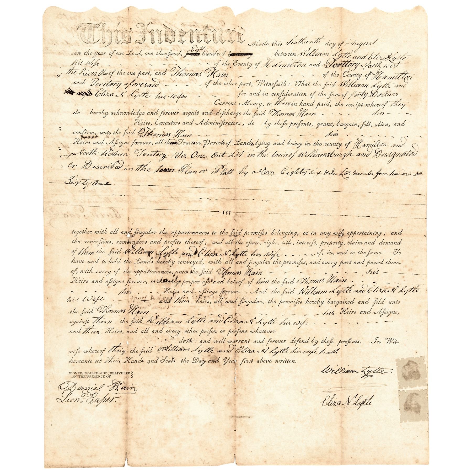 The historic Lytle family members served in the French and Indian War, the American Revolutionary War, the Mexican–American War, and the Civil War. In addition, this Document is also Autographed by “Daniel Hain” and “Leonard Raper,” two notable early Ohio Pioneers, having their two small Paper and Wax Seals are attached to the two names as witnesses at the bottom left. An important Document with two rare signatures from prominent, historic early American families!