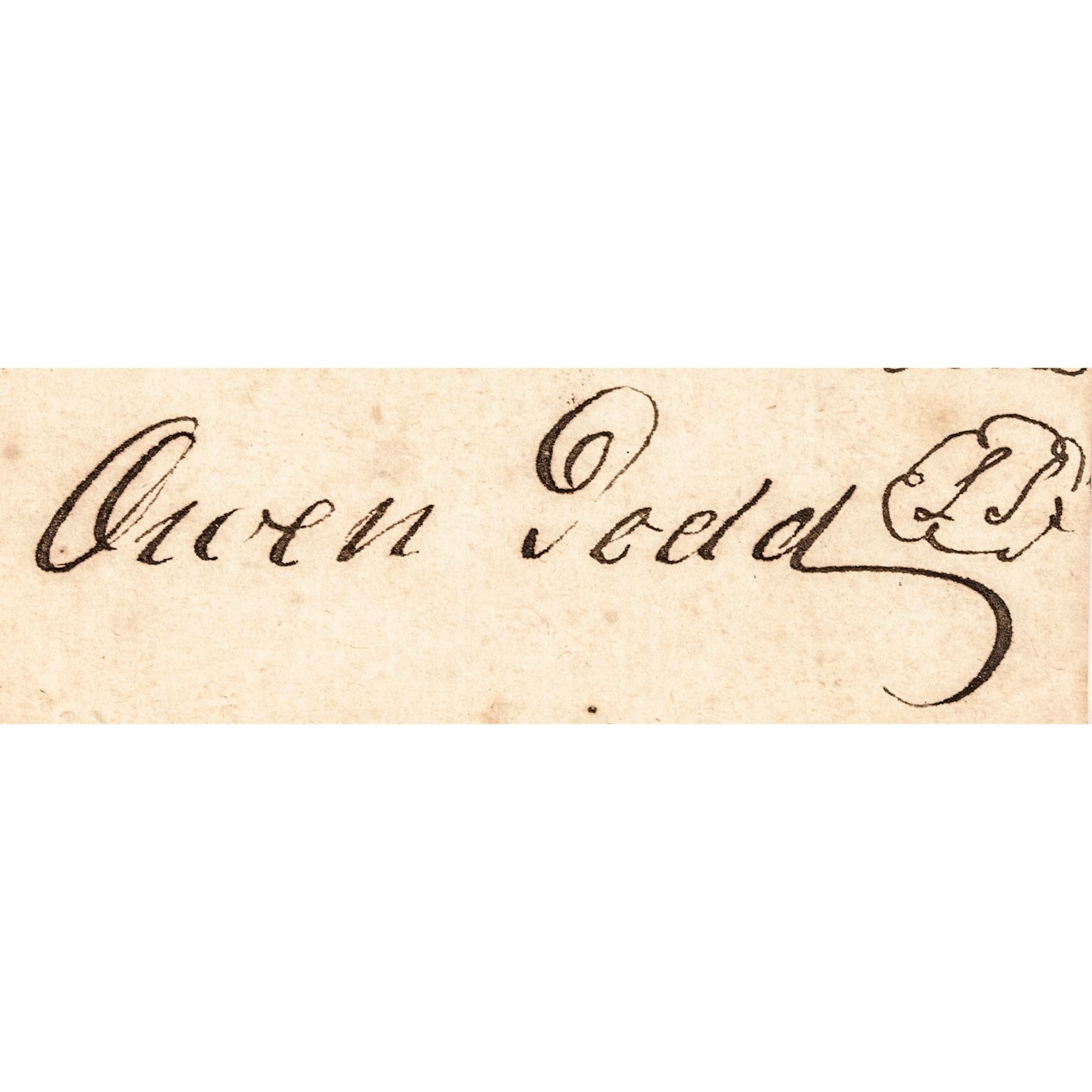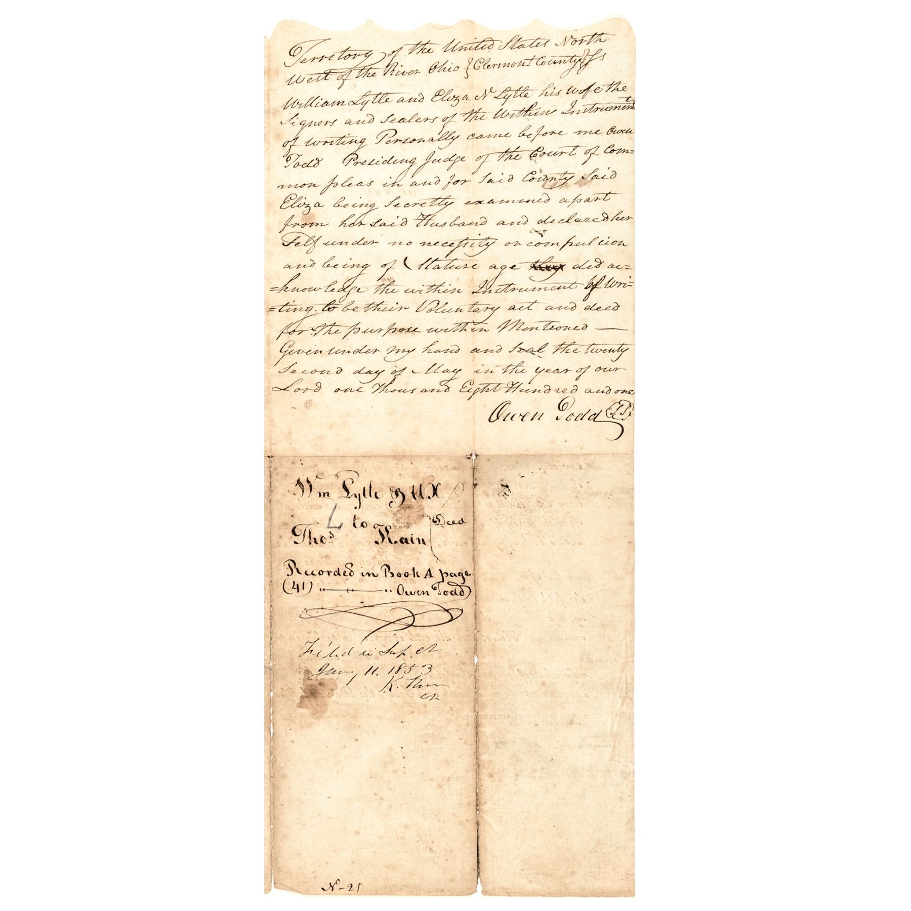 This Partly-Printed Document is Signed, “Owen Todd” (1762-1817) is clearly signed on back by Owen Todd who was Mary Todd Lincoln’s Great Grand Uncle. A large Legal Document with expected folds having light tone, and a few trivial intersection pinholes, measuring 12.75” x 15.25” with an official scalloped top margin edge. This land transaction Document is selling land in the Ohio Territory. It is printed in black with the manuscript portions and signatures in brown ink on laid period paper. Autographed by “William Lytle” and his wife Eliza N Lytle,” plus the Docket on the blank reverse is handwritten and Signed by Judge “Owen Todd”.
