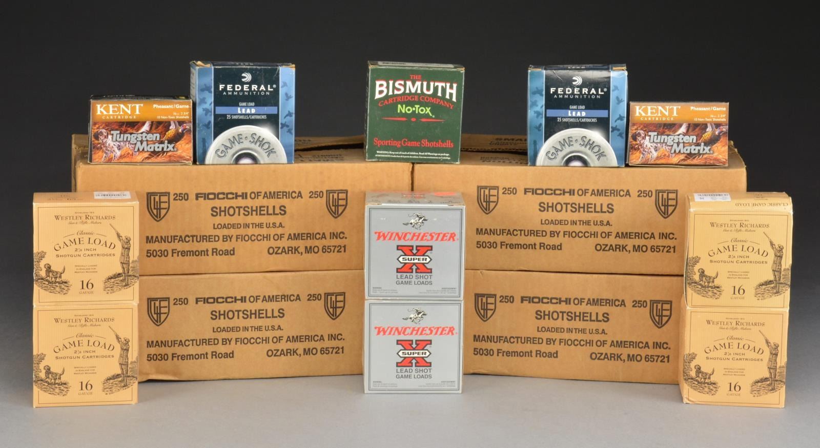 ALL BOXES ARE FULL 25 RD. UNLESS NOTED. 4 Cases (each 10 boxes of 25 rds.) Fiocchi 2 3/4" No. 7 1/2 shot. / 4 Boxes of Westley Richards 2 1/2" Game Load No. 8 / 1 Box of Federal 2 3/4" Game Load No. 6. / 2 Boxed of Win. Super X Game Load 2 3/4" No. 6 / 1 Box of Bismuth Sporting Game 2 3/4" No. 4. / 1 Box of Kent Cartridge Tungsten Matrix 2 3/4" No. 5. / 1 Partial box of Kent Cartridge Tungsten Matrix No. 5. / 1 Partial box of Federal Game Load 2 3/4" No. 6. / 1 Partial box of 12 Ga. & 16 Ga. ammo. CONDITION: boxes show light wear & ammo in very good serviceable condition. (02-14694/MD). $300-400.