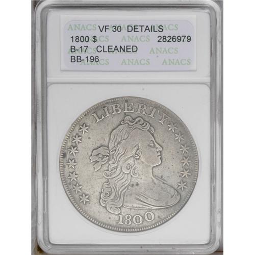 <B>1800<img border='0' src='http://www.heritagecoins.com/images/star.gif' width=10 height=10>$1> 12 Arrows--Cleaned--ANACS. VF30 Details.</B></I> B-17, BB-196, R.1. A richly detailed example of this popular large early silver type. The cloud-gray surfaces are finely hairlined, the obverse has a few small charcoal spots, and a scratch crosses the rightmost cloud.
