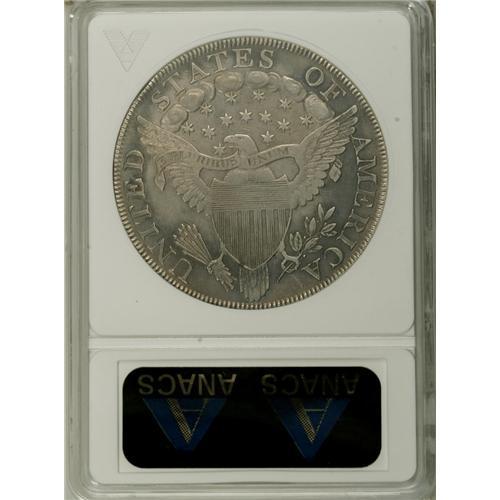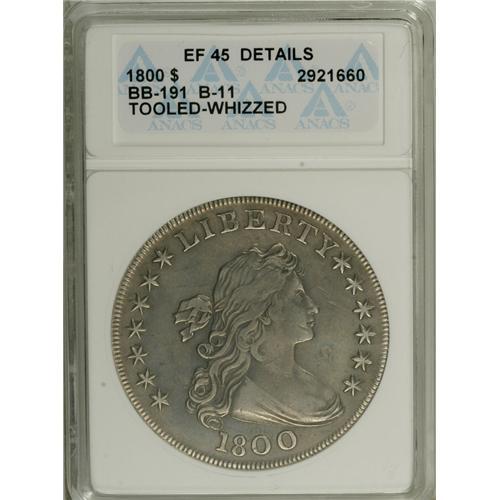 <B>1800 S$1 AMERICAI--Tooled, Whizzed--ANACS. XF45 Details.</B></I> B-11, BB-191, R.5. The scarcer of the two AMERICAI Bolender varieties, B-11 is distinguished from B-19 by the position of the first star, distant from the bust. The lower right obverse field near the chin has been smoothed, and the appearance is subdued from whizzing. Still a sharp example of this better die marriage.<BR><BR><b>Shipping:</b> Coin/Currency (<a target="_blank" href="http://www.heritageauctions.com/common/shipping.php">view shipping information</a>)
